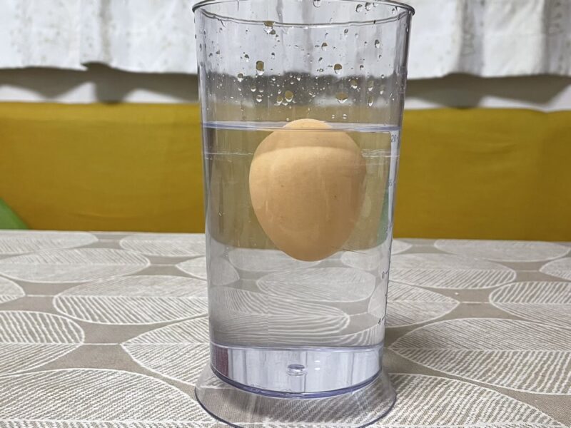 水に塩を溶かし、卵を浮かべ、卵が500円玉位の大きさだけを水面に出る程度の塩分濃度に調節。