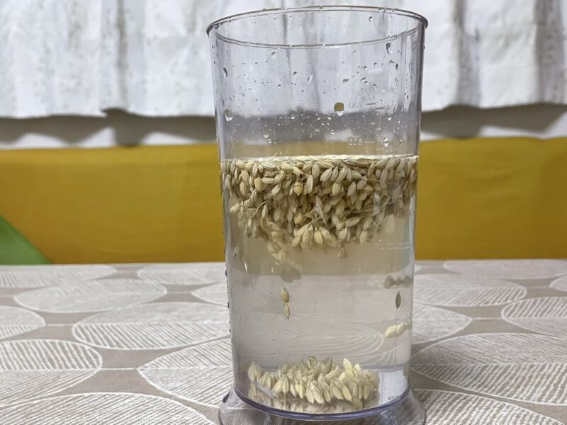 少量の種もみだったので、家にあったブレンダー用の容器でやってみました。大きな容器だと塩がたくさん必要になるので100グラム程度であれば、これで全然問題なくできますよ。