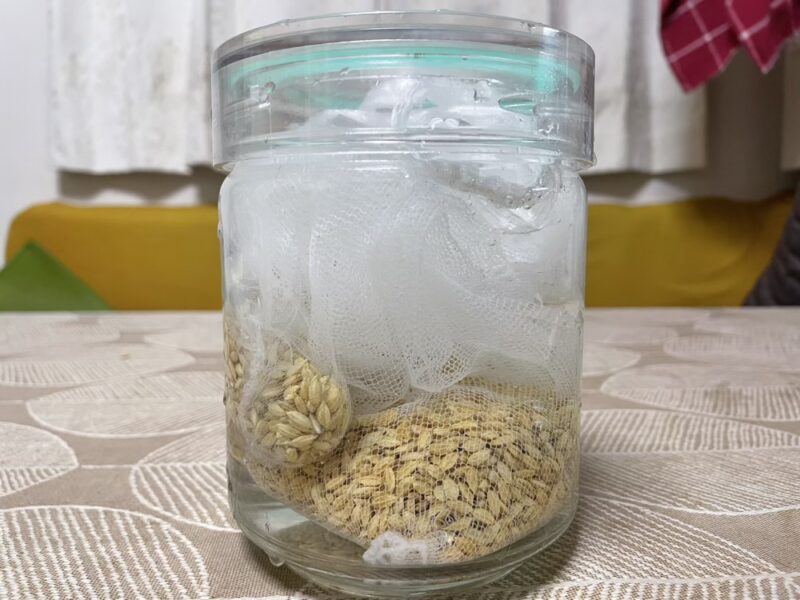 というわけで、水を張った瓶に種もみを浸し、
