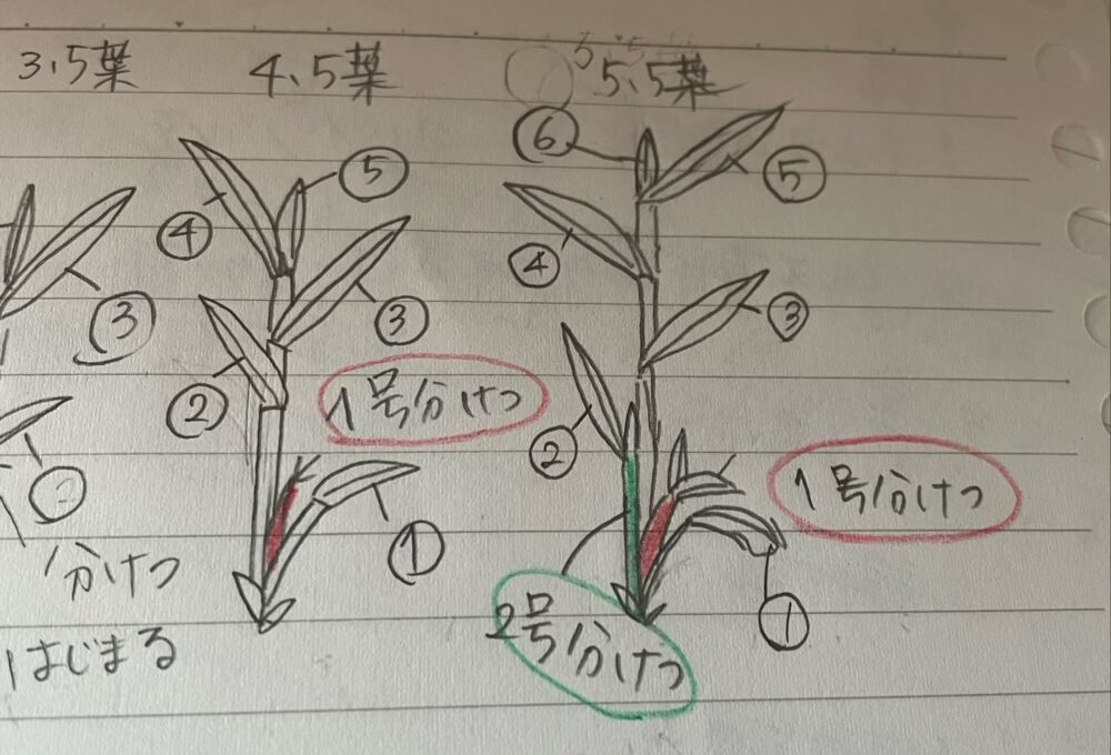 この後も〇枚目の葉っぱが出たら3つ目の株が出る、4つに分かれるときは〇枚目など、きちんとした法則性を持って株が増えていくそうです。