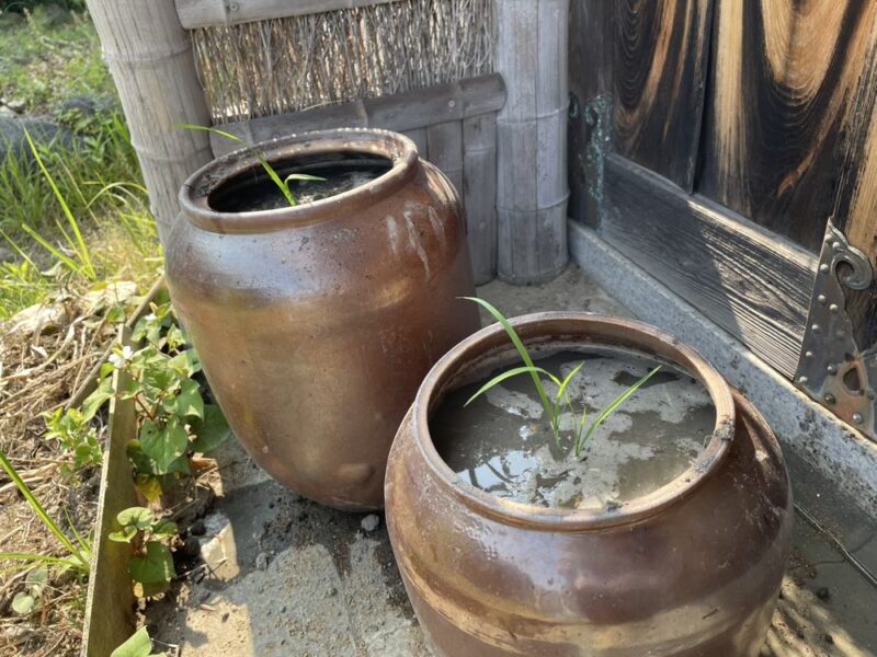 植えるのは、蓋がなくなって本来の用をなさなくなった甕2つと漬物樽1つ、大きな植木鉢にゴミ袋を貼って水漏れしないようにしたもの2つ、の合計5つ。それに土を入れ、水を土の表面より5センチから10センチくらいまで満たし、そこに苗を植え付けました。