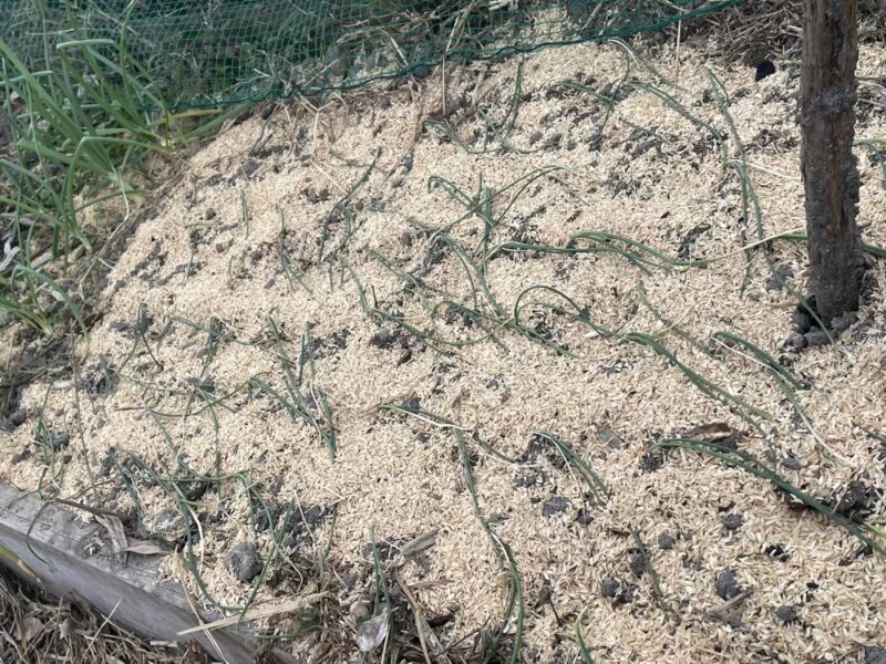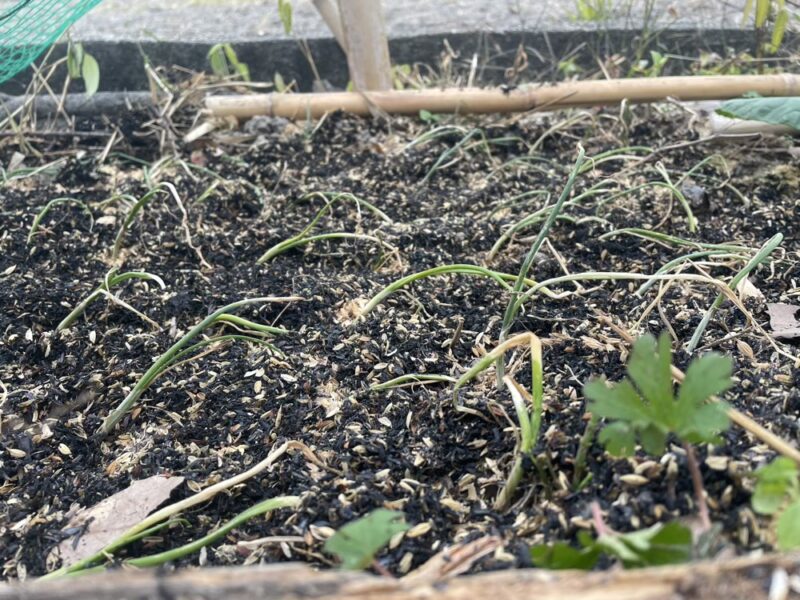 そして炭化してもなおしっかりカタチをたもっているもみがらは空気を含み、これからの寒さからタマネギ苗をまもってくれる!はず。