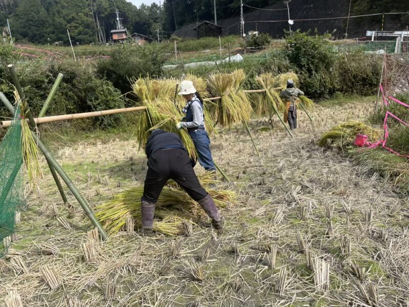 手に鎌をもち刈り取り、稲わらのひもを使って手作業で稲を束ねて、はざかけする。今日までコツコツコツコツ皆さんがちょっとずつすすめてくれていた稲刈り。