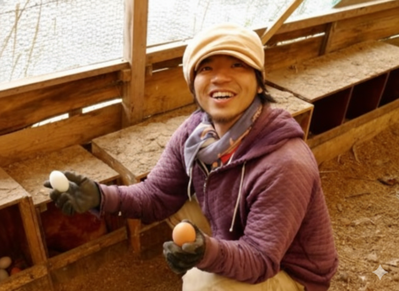 元バンドマン・料理人としての感性を活かし、自然と人をつなぐ有畜循環型農業を実践する農業家です。廃棄物を活用した自家配合飼料や自然養鶏で地域資源を循環させ、鶏舎の周辺の畑をシェア畑として解放、利用者に作物の育て方や、土の育て方を日々指導。その傍らで森の環境を整備し、山全体の環境を整えることにも取り組んでおられます。